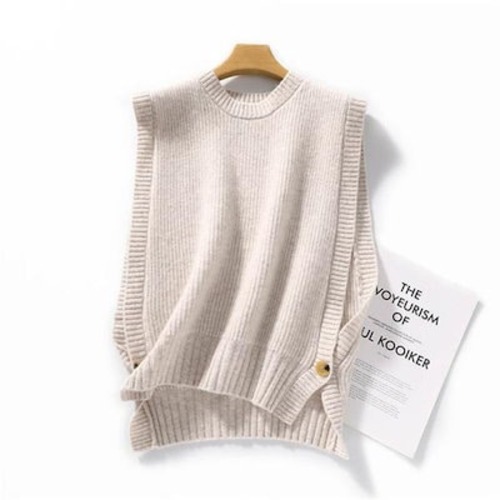 ニットベストレディースクルーネックプルオーバーチョッキ重ね着着痩せノースリーブレイヤードカジュアルコーデ細身サイドボタン