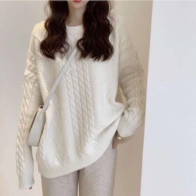 ニットセーターレディース秋冬ニットケーブル編みセーター冬リブニットクルーネック長袖プルオーバー大人暖かい防寒エレガントきれいめ通勤