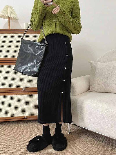 タイトスカートレディース秋冬ニットスカートロングスカート無地ニットタイト膝丈スカート無地タイトスカートバックスリット秋冬タイトボタン飾るペンシルスカートミモレ丈レト