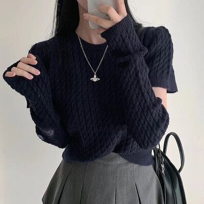 ニット セーター トップス レディース 半袖 半袖ニット 秋 冬 アームカバー付き ケーブル編み クルーネック アームウォーマー付き 2WAY 指抜き きれいめ シンプル カジュアル かわいい 無地
