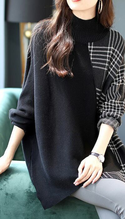 セーター ニット 秋 長袖 ニットセーター チェック レディース ハイネック 秋 冬 ドルマンスリーブ きれいめ 長袖 プルオーバーセーター アシンメトリー 切り替え 大きいサイズ ゆったり 秋冬物