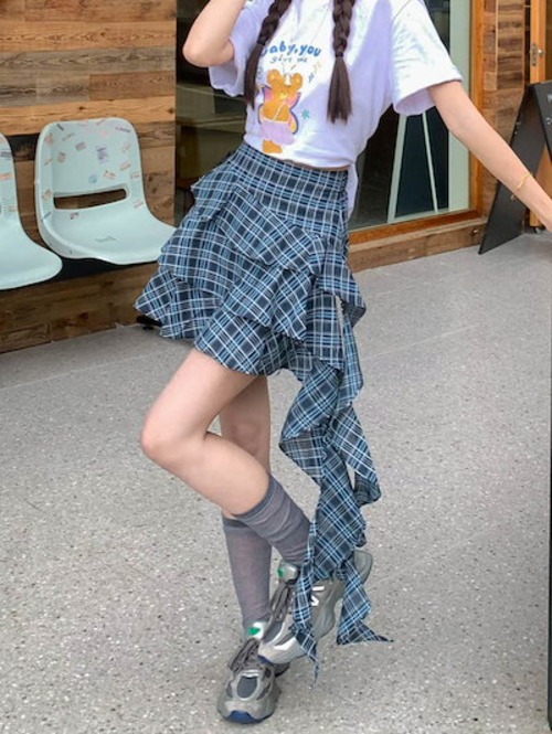 2024春夏スカート ミニ丈 チェック柄 不規則 ハイウエスト 美脚効果 脚長効果 細見え 夏 おしゃれ かわいい 韓国ファッション レディース お出かけ