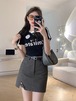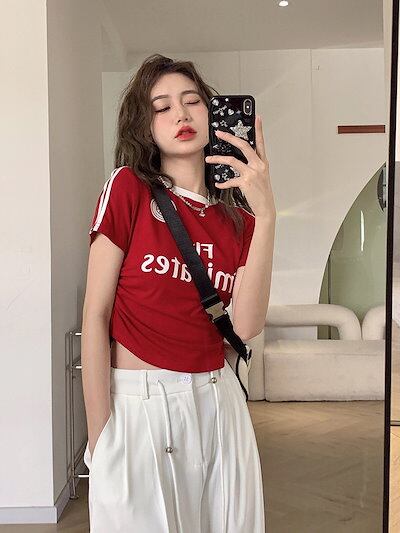 2024 夏 韓国トップス プリント半袖 Tシャツ 韓国 ラウンドネック スリム 可愛い風へそ出し ショート おしゃれスリーブ カジュアルサイドコーデ丈 ファッション系レディースフレンチお出かけ T