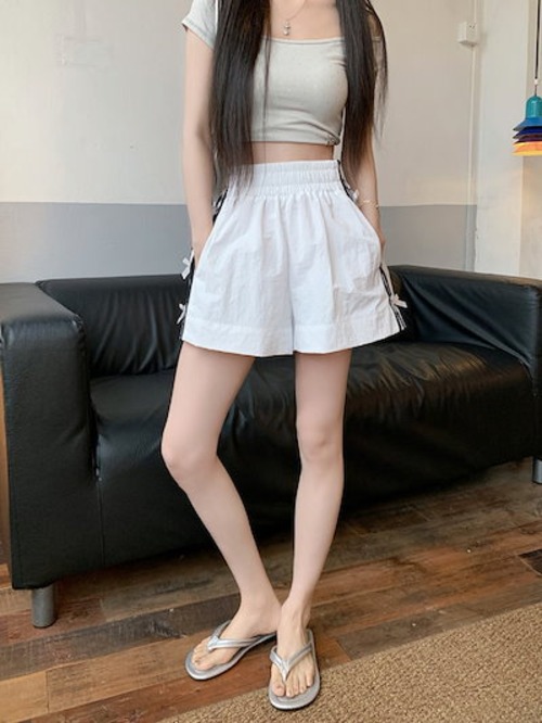 2024 春夏パンツ ショート丈 ワイド ウエストゴム ハイウエスト 美脚効果 脚長効果 細見え 短パン 黒白 おしゃれ かわいい 韓国ファッション系 レディース サイドお出かけ