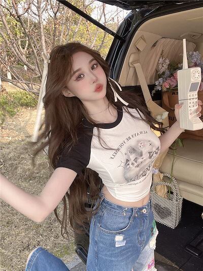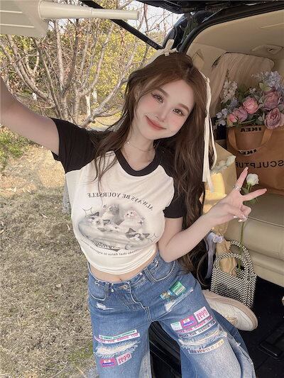 2024 夏 韓国トップス プリント半袖 Tシャツ 韓国 ラウンドネック スリム かわいいへそ出し ショート おしゃれスリーブ カジュアルセットアップコーデ丈 ファッションレディース フレンチお出かけ