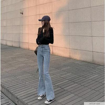 レディース女性韓国のファッション レトロなハイウエストスリムスリミングジーンズ デニムフレアパンツ E26ジンズ デニム
