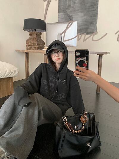 2024秋冬トップス 普段使い 韓国風長袖レトロパーカーカジュアルルーズファッション系ゆったり大人っぽかわいいレディースフード付き羽織りサイズきれいめシルエットトレーナー_ 大学生通学高校