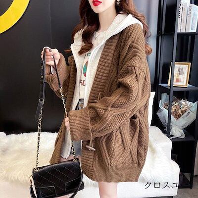 ニットパーカー レイヤード風 フード付き ケーブル編み ニットカーディガン レディース アウター