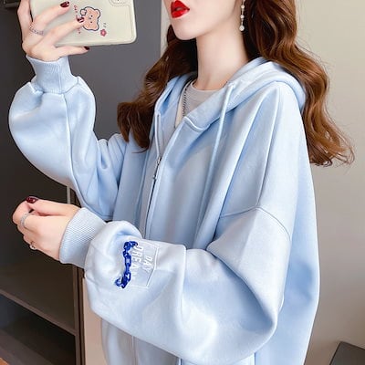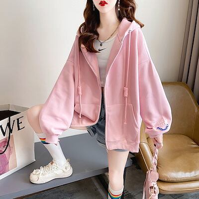 秋冬 保温 ソフト コート レディース 無地 刺繍 ジップアップ フード付き スウェット レディース トップス