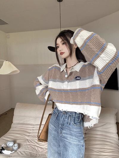 おしゃれ ボーダー ポロシャツ ショート丈 ニットトップス セーター 新品 レディース ゆったり 怠惰風 長袖ニット インナー