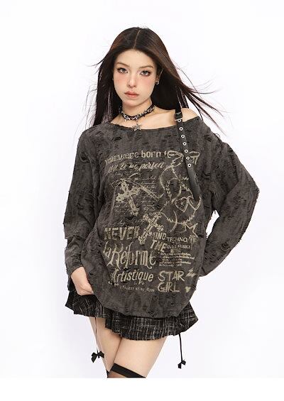 2024秋冬ワンショルダー ダメージ加工 トップス ストラップ tシャツ グラフィックプリント オーバーサイズ ロンt 長袖 韓国ファッション レディース