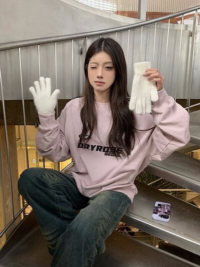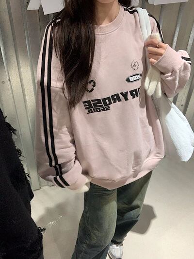 2024 秋冬 トレンド2type 裹起毛トップスバイカラー長袖 かわいいK-POPTロング黑レディース韓国風ロゴ衣装ルーズゆったりカジュアルおしゃれサイズスリーブシルエットファッション系サイド春