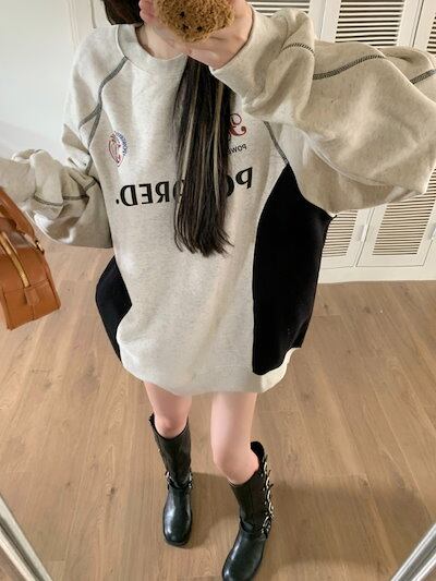 2024 秋冬トレンド 2type 裹起毛トップス 長袖かわいいTシャツレディース韓国風衣装ルーズゆったりカジュアルおしゃれサイズスリーブシルエットファッション系サイドシャツフットバイカラーニュートロ