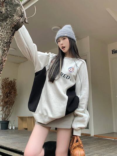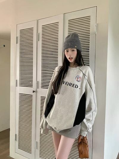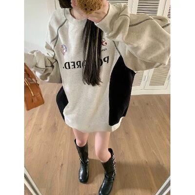 2024秋冬トレンド2type裹起毛トップス長袖かわいいTシャツレディース韓国風衣ルーズゆったりカジュアルおしゃれサイズスリーブシルエットファッションサイドシャツフットバイカラーニュートロ