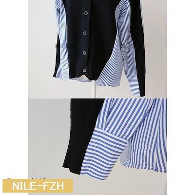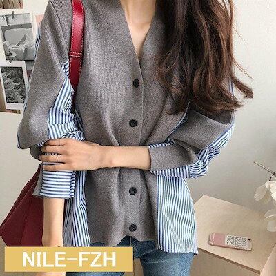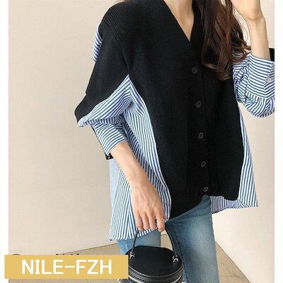 アウター 長袖 レディース デザイン ニット シャツ トップス フェイクレイヤード ストライプ 偽二枚 ボタン留 前開き ドッキング Vネック 保温 ファッション