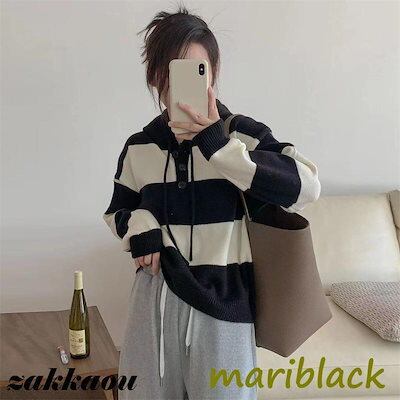 レディース トップス ストライプ フード 秋冬 新商品 緩い アウターウェア ニットセーター