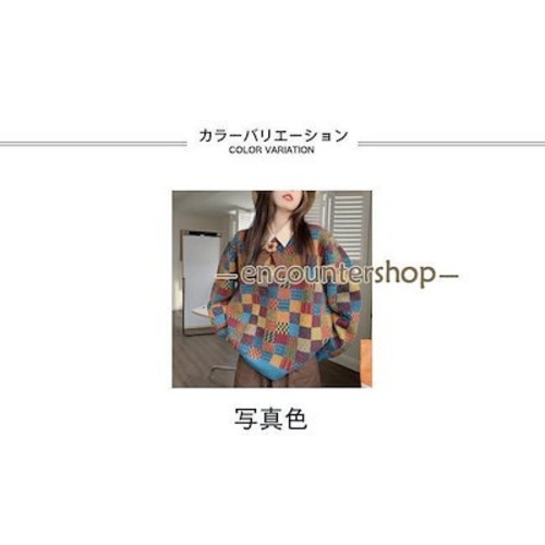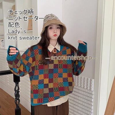 ニットセーター レディース アウター 配色 チェック柄 クルーネック 長袖 リブ編み 切り替え 柔らかい 暖かい 大人可愛い 秋冬