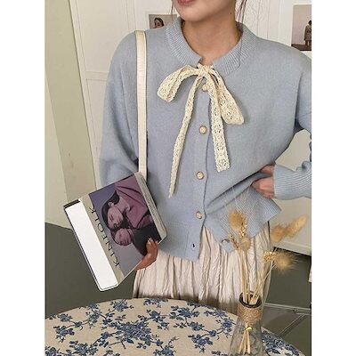 ニットカーディガン レディース リボン 羽織り レース ラウンドネック カーディガン 長袖 ニット セーター レイヤード ポールボタン アウター コート 着回し