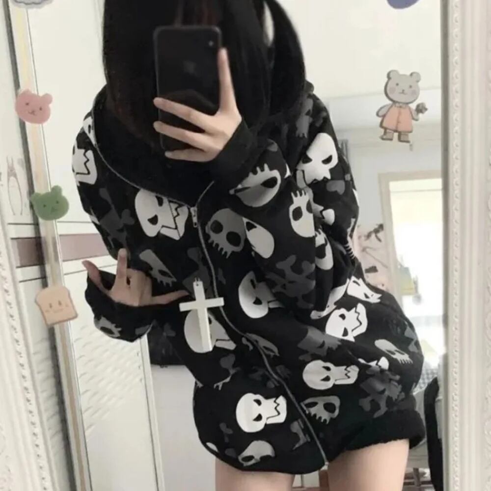 女性用長袖スカルスウェットシャツ,ジッパー付きカーディガンフーディー,emoストリートウェア,レイブアウター,ダークゴシック,サイバーパンク,原宿,y2k,2024 パーカー ジャージ y2k T240908140700_01