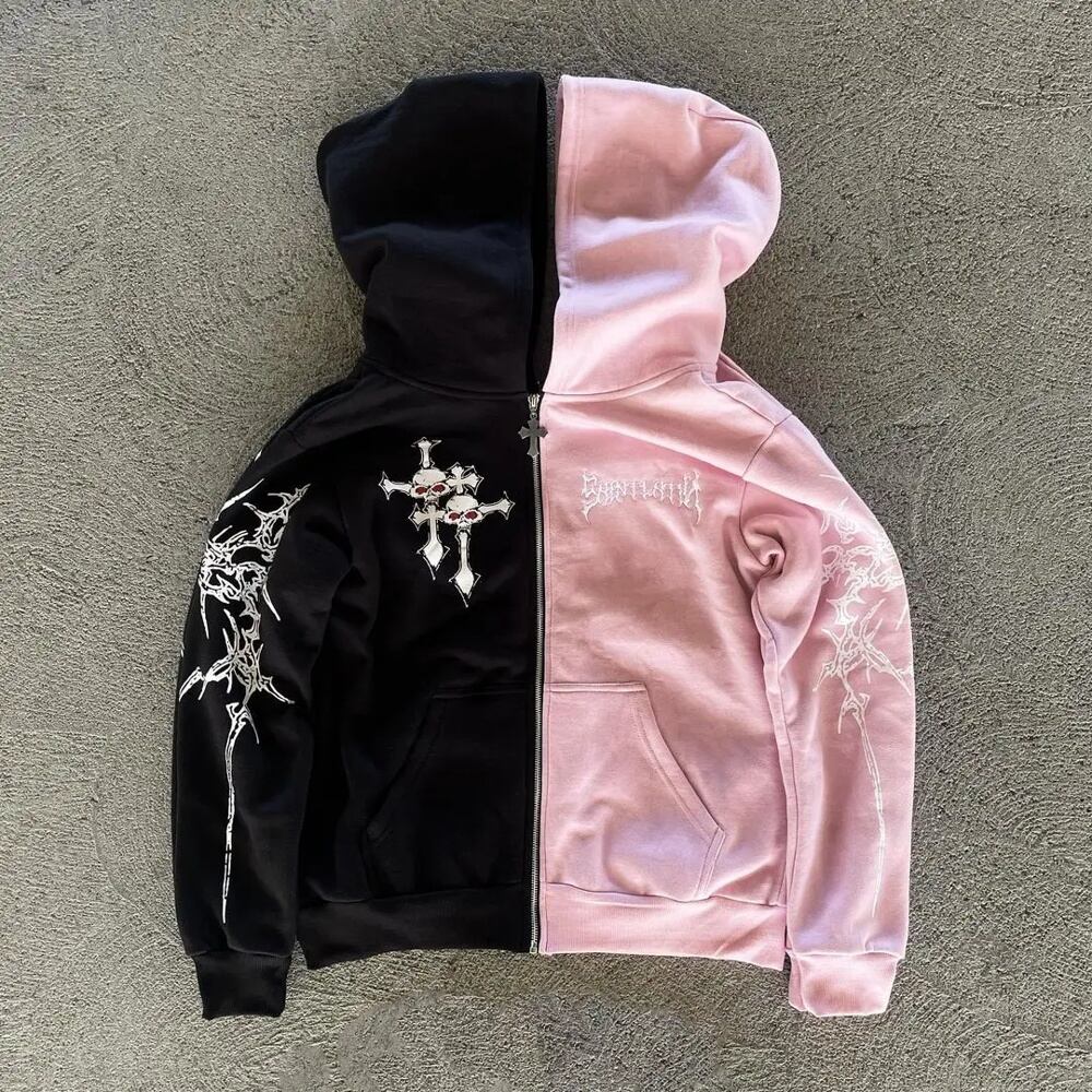 女性のパンクスタイルのジャケット,特大,ジッパー付きカーディガン,ルーズフード付きスウェットシャツ,レトロなスカルプリント,ハイストリート,秋冬,y2k パーカー ジャージ y2k T240908140824_03
