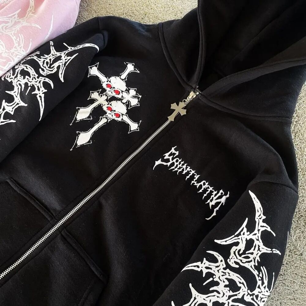 女性のパンクスタイルのジャケット,特大,ジッパー付きカーディガン,ルーズフード付きスウェットシャツ,レトロなスカルプリント,ハイストリート,秋冬,y2k パーカー ジャージ y2k T240908140824_05