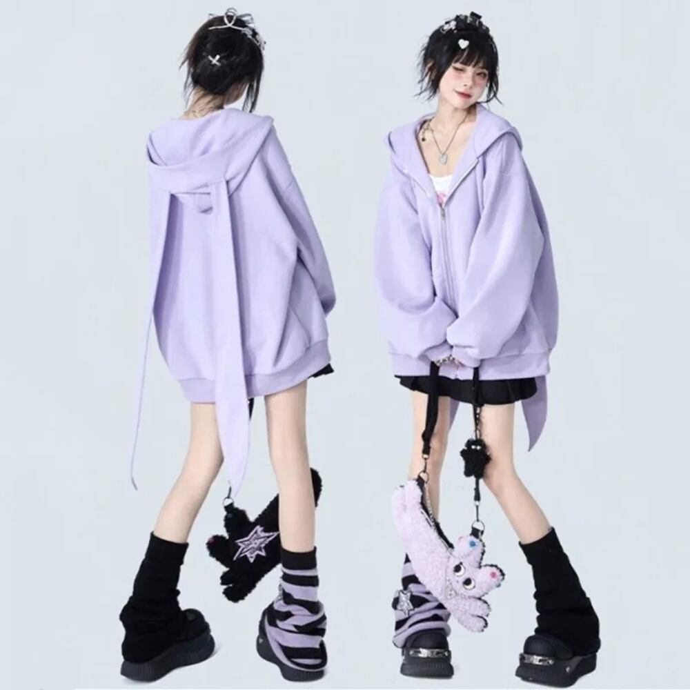 レディースラビットフード付きスウェットシャツ,エクストラロングイヤー,カジュアルカーディガン,ジッパー付きパーカー,y2kストリートウェア,モノクロ,新品,秋冬,2022 パーカー ジャージ y2k T240908141204_01