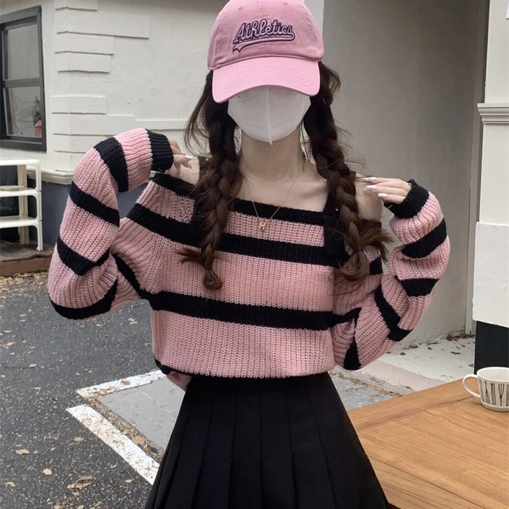 女性のストライプのスラントネックニットセーター、オフショルダープルオーバー、ルーズジャンパー、パッチワーク、甘い、韓国のファッション、セクシー、秋、y2k パーカー ジャージ y2k T240908141312_01