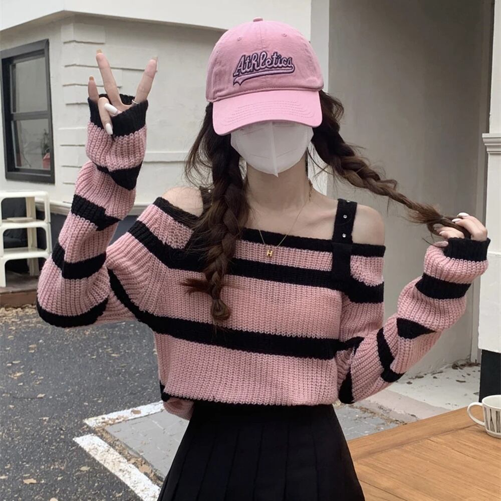 女性のストライプのスラントネックニットセーター、オフショルダープルオーバー、ルーズジャンパー、パッチワーク、甘い、韓国のファッション、セクシー、秋、y2k パーカー ジャージ y2k T240908141312_02