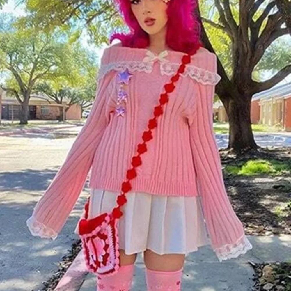 女性のオフショルダーセーター、長袖、レーストリム、オープンバックストラップ、ニットトップ、かわいいプルオーバー、ジャンパー、クロップトップ、シャツ、y2k パーカー ジャージ y2k T240908141331_04