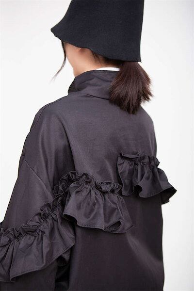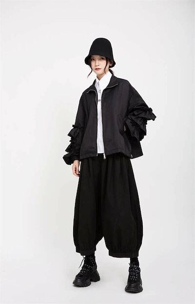 アシンメトリージャケット フリルパーカー レディース 袖フリル パーカー おしゃれ バックフリル 羽織り ジャケット ブルゾン ゆったり アウター 大人 ナチュラル 大きいサイズ バルーン袖 体型カバ