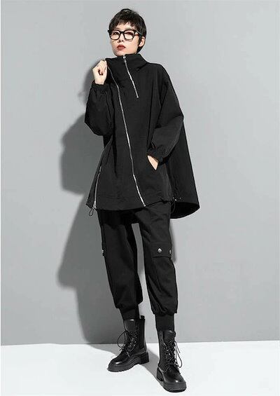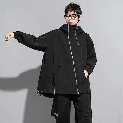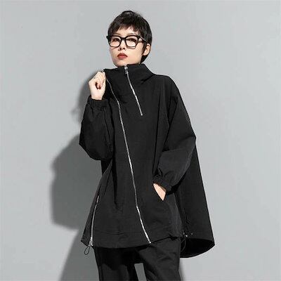 斜めジップパーカーブルゾン ブルゾン パーカー レディース ライトアウター ジャケット 羽織り 長袖 アシンメトリー スタンドカラー 斜めジップ 裾変形 秋 冬 無地 モード系 個性的 大人 カジュア