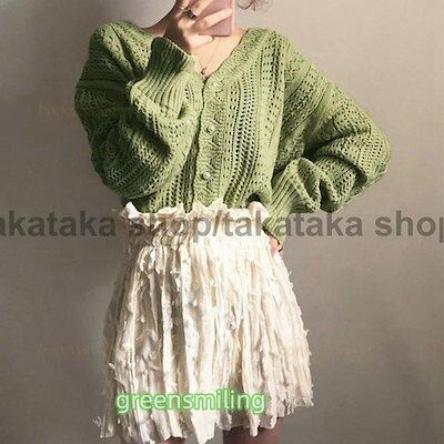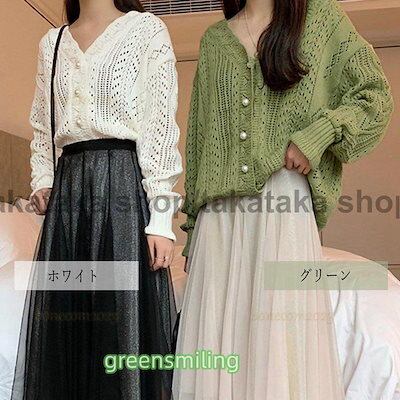 ニットカーディガン レディース 透かし レース編みカーデ 春 vネックニット 長袖 パールボタン トップス 新作 かぎ針編み 羽織り