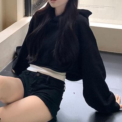 2024 秋冬ス フード付き スウェット 長袖 丈短め 秋 黒 ブラック おしゃれ かわいい 韓国ファッション レディース お出かけ安い