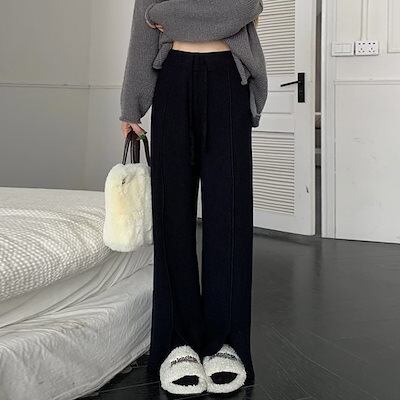 ニットワイドパンツ ゆったりスウェット 韓国ファッション スリット ワイドパンツ スウェット ズボン ニットワイドパンツレディース秋冬 厚手 防寒 ニットパンツ クリスマス