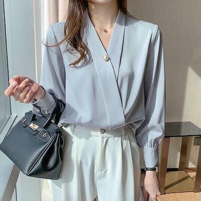 ブラウス レディース トップス シャツ インナー スーツインナー ビジネススーツ 春夏 秋冬 長袖 Vネック パール付き パール 飾りボタン付き オフィスカジュアル フォーマル 無地 シンプル 上品