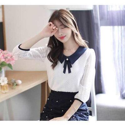 ブラウス シャツ レースブラウス レディース パフスリーブ ミドルスリーブ ロングスリーブ 長袖 リボン レトロ クラシカル フェミニン 透かしレース かわいい きれいめ 上品 デート 春夏