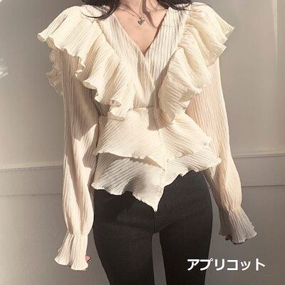 ブラウス フリルブラウス Vネック レディース シャツ プルオーバー 長袖 ショート丈 クロップド丈 ボリューミー ゴージャス ブラック きれいめ エレガント 華やか パーティー フォーマル
