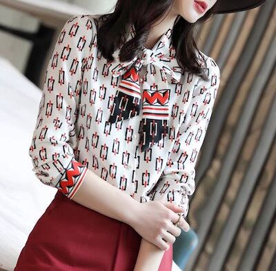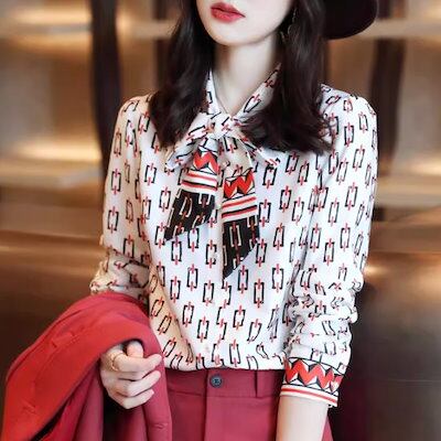 シフォンブラウス レディース トップス シフォンシャツ 長袖ブラウス 長袖シャツ リボンタイ 総柄 大人っぽい 上品 きれいめ エレガント カジュアル お出かけ おしゃれ オフィス プリントブラウス