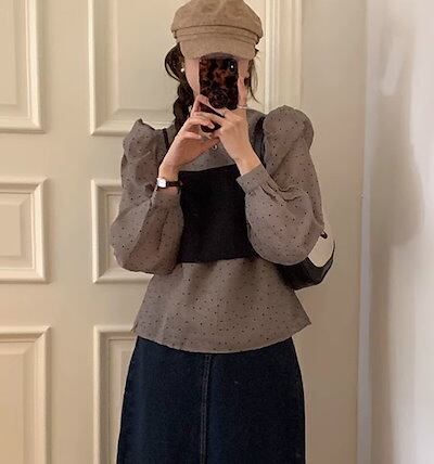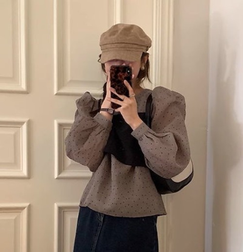 シフォンブラウス レディース トップス ブラウス シャツ プルオーバー 水玉 ドット柄 長袖 ボリューム袖 パフスリーブ ラウンドネック カジュアル お出かけ おしゃれ きれいめ 女性