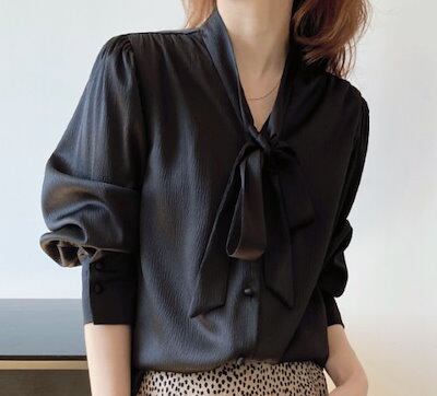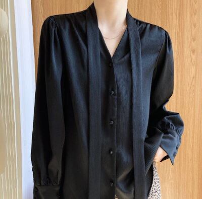 長袖シャツ レディース ブラウス ボウタイ リボン Vネック トップス フロントボタン ドレープ 光沢 シンプル 無地 きれいめ カジュアル お出かけ おしゃれ エレガント OL オフィス フォーマル