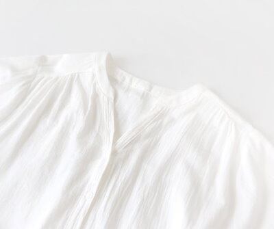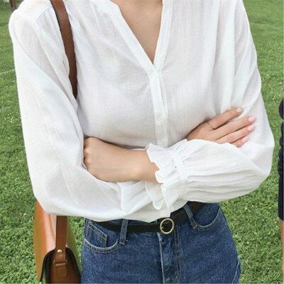 ブラウス レディース 長袖シャツ トップス 白シャツ ホワイト Vネック 綿 コットン フロントボタン カジュアル お出かけ シンプル 無地 きれいめ 袖口フリル おしゃれ ファッション 女性