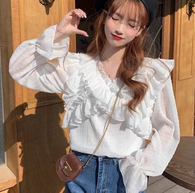 シフォンブラウス レディース トップス シフォンシャツ 長袖ブラウス Vネック フリル クロスデザイン フェミニン ガーリー 可愛い カジュアル お出かけ おしゃれ キャンディスリーブ 春夏 女性
