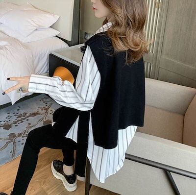ツーピース 2点セット レディース トップス シャツ ベスト ストレート ロング お尻まですっぽり 長袖 カフスリーブ Vネック 襟付き ストレート かわいい 大人可愛い きれいめ シンプル カジュア