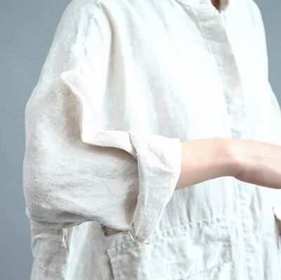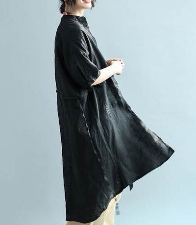 レディース トップス シャツ ロング 長袖 スタンドカラー ワイド ポケット 前開き リネン コットン 大人可愛い きれいめ シンプル カジュアル 上品 おしゃれ かっこいい ラフ ルーズ クール エ