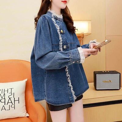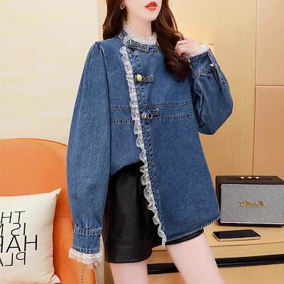 トップス シャツ ブラウス レディース 長袖 ハイネック アシンメトリー フェミニン ストリート レース 前開き ボタン 切り替えデザイン ドッキング デニム ブルーデニム 異素材ミックス かわいい