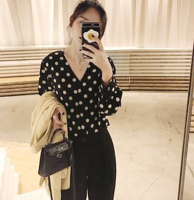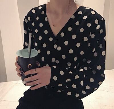 ポルカドット長袖ブラウス レディース シャツ トップス Vネック ドット柄 水玉 総柄 フロントボタン 黒 ブラック ポルカドット カジュアル お出かけ おしゃれ 春夏 長袖シャツ 女性 長袖ブラウス シャツ