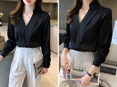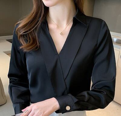 シフォンブラウス レディース シャツ トップス Vネック シンプル 無地 襟あり 長袖 カジュアル お出かけ おしゃれ きれいめ オフィス 通勤 袖口ボタン プルオーバー ファッション 女性 ブラウス