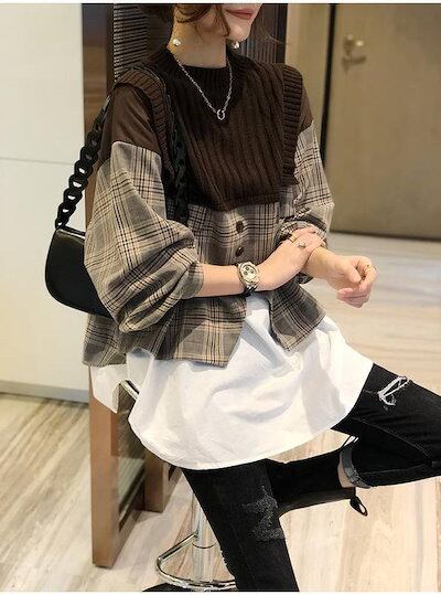 トップス レディース シャツ ブラウス ニット 長袖 襟付き 異素材ミックス 上品 休日 薄手 秋 冬 大人 可愛い きれいめ シンプル お洒落 女子 10代 20代 30代 カジュアル クール こな