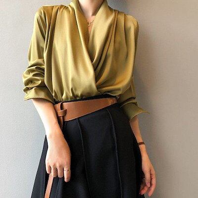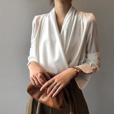ブラウス レディース 長袖 シフォン オフィス カシュクール 白ブラウス トップス 白 ホワイト グリーン 無地 シンプル M L ショート丈 カシュクールブラウス フォーマル ドレープ Vネック お