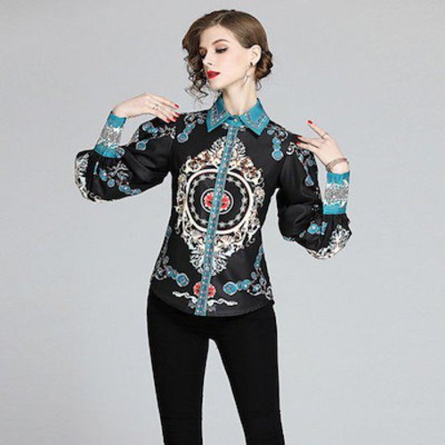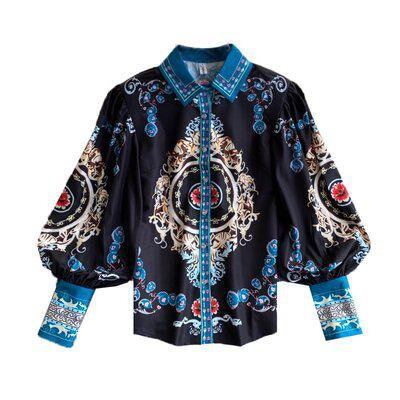 シャツ レディース 長袖 袖あり トップス ブラウス ボトミングシャツ ランタンスリーブ ボリューム袖 大きいサイズ 2XL ブルー ゴールド 花柄 フラワープリント 10代 20代 30代 ゴージャ